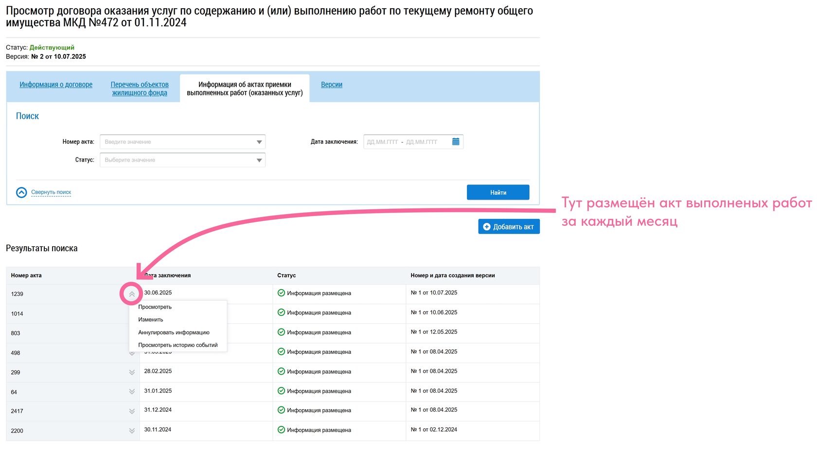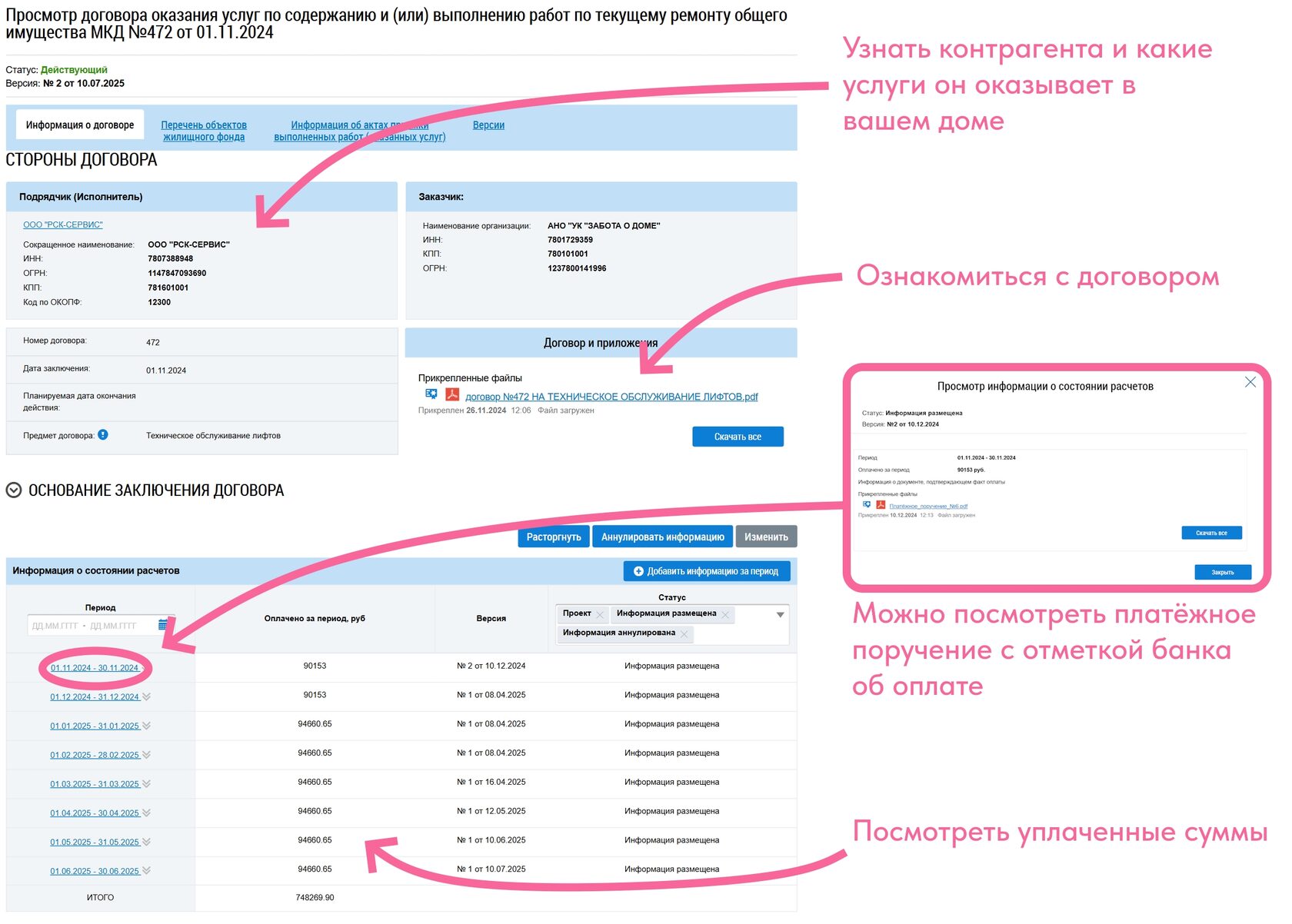 В ГИС ЖКХ размещается (и следовательно её можно найти) следующая информация: реквизиты контрагента, предмет договора (какие услуги оказывает), сам договор, сумма начислений, платёжное поручение (для подтверждения факта оплаты), акты выполненных работ.