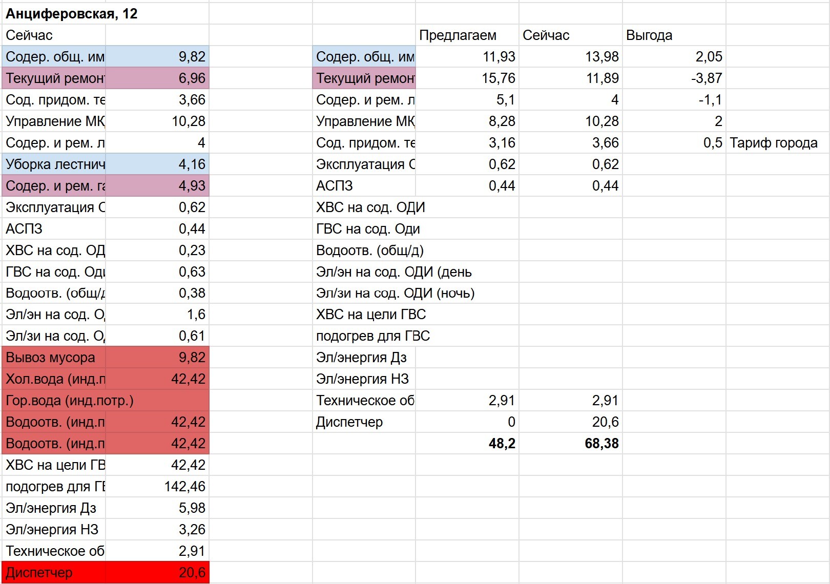 Мы объединяем текущие строки "Содержание общего имущества МКД" с "Уборка лестничных клеток", а также "Текущий ремонт" с "Содержанием и ремонтом газовой котельной", потому что так правильно. По итогу "Содержание общего имущества МКД" будет стоить 11,93 рубля, против нынешних 13,98 (выгода 2.05 рубля). Также мы видим возможность снизить плату по статье "Управление МКД" на 2 рубля с 10,28 до 8,28.